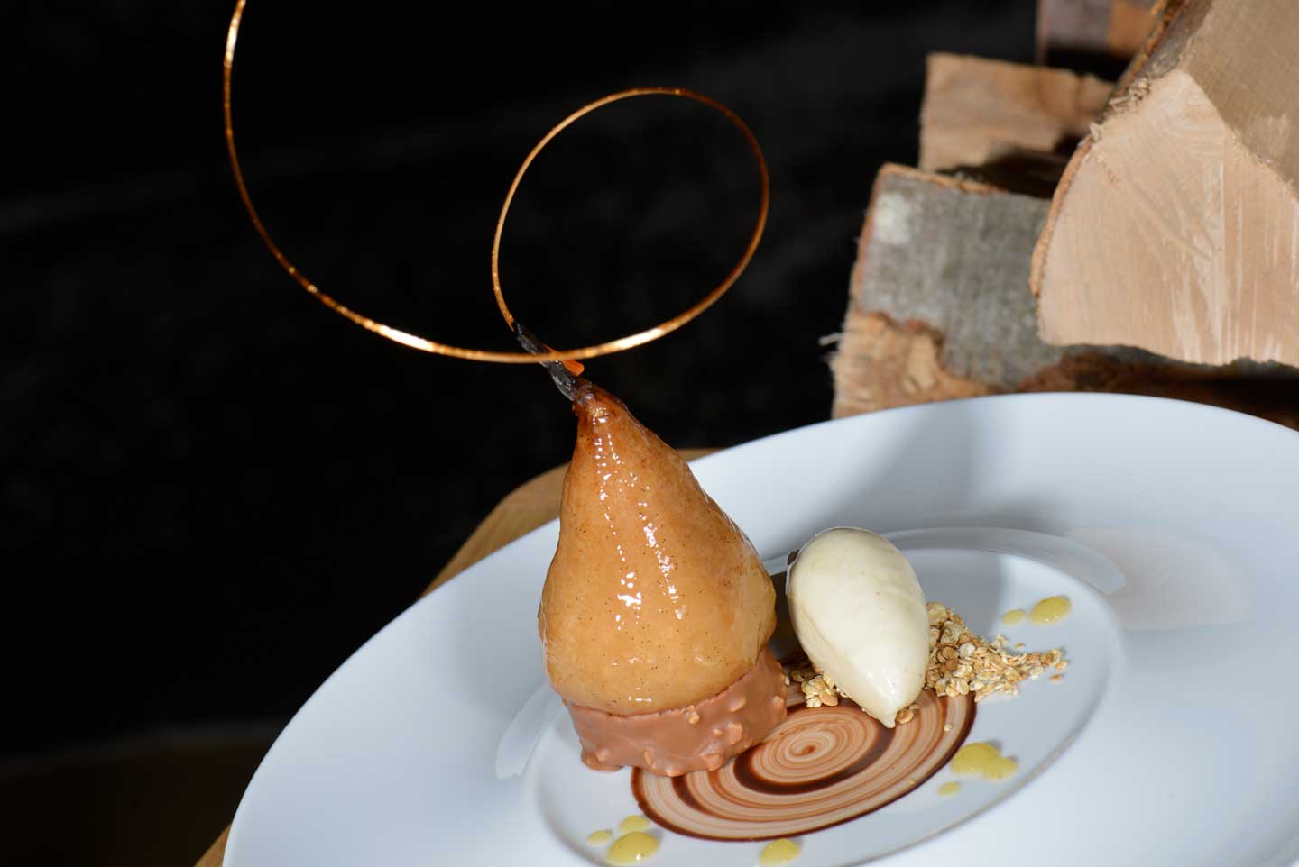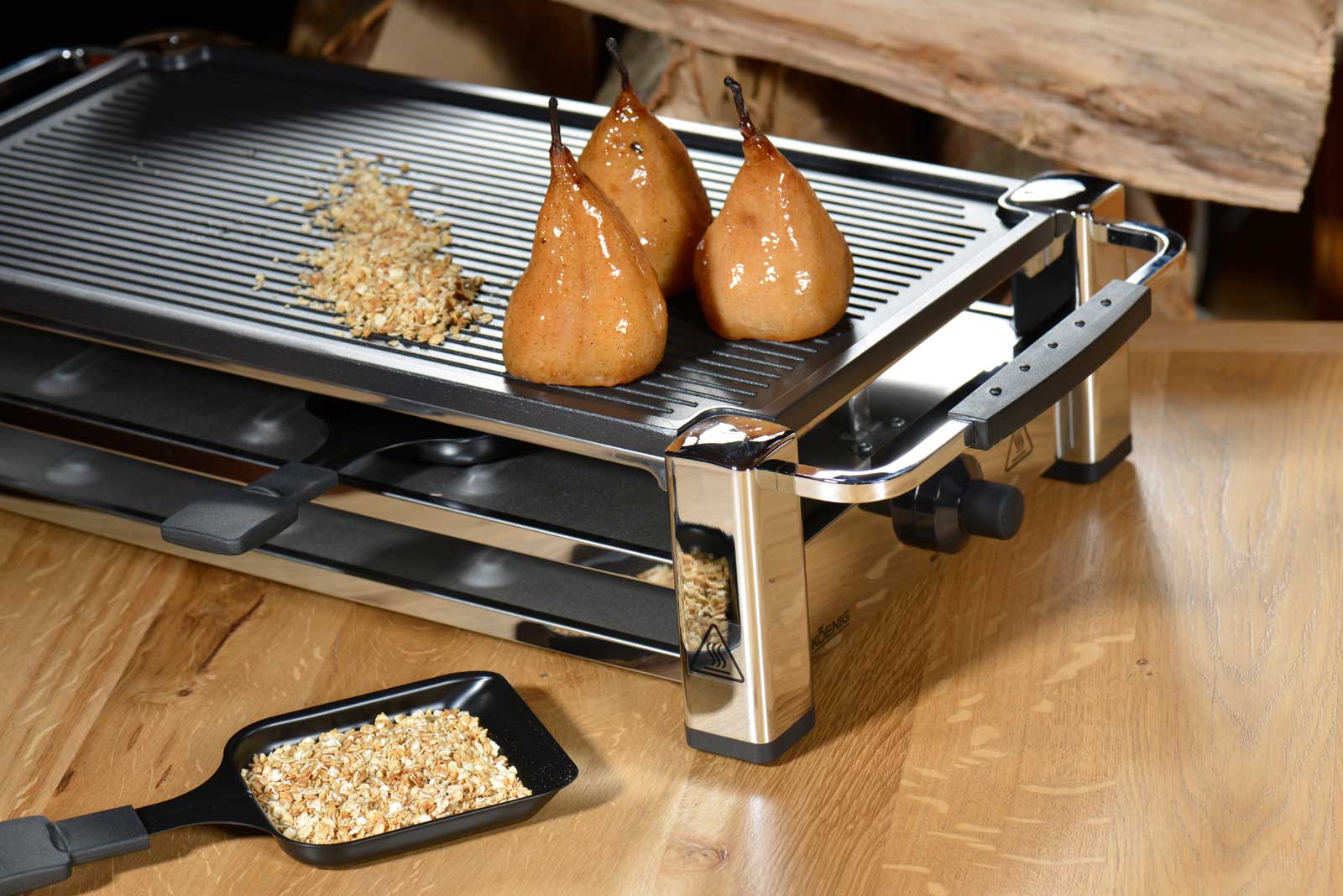 Pelez, coupez en deux et évidez la poire. Cuire sur le gril de table avec le beurre, le sucre et la gousse de vanille.