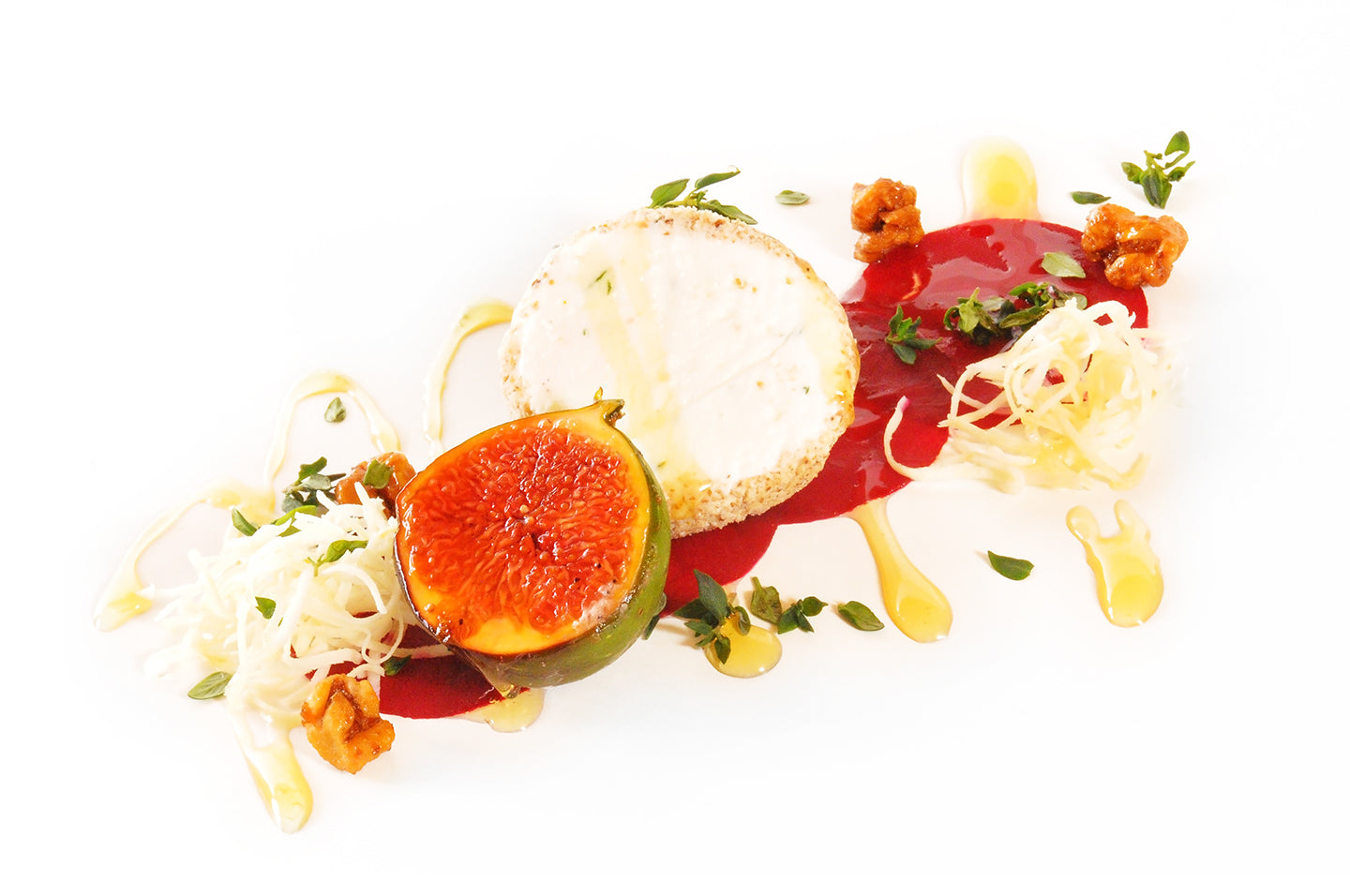 Enfin, disposer les figues, les betteraves et les boules de cream cheese avec le raifort râpé, les noix caramélisées, les feuilles de thym et le miel et décorer d'un peu de fleur de sel.