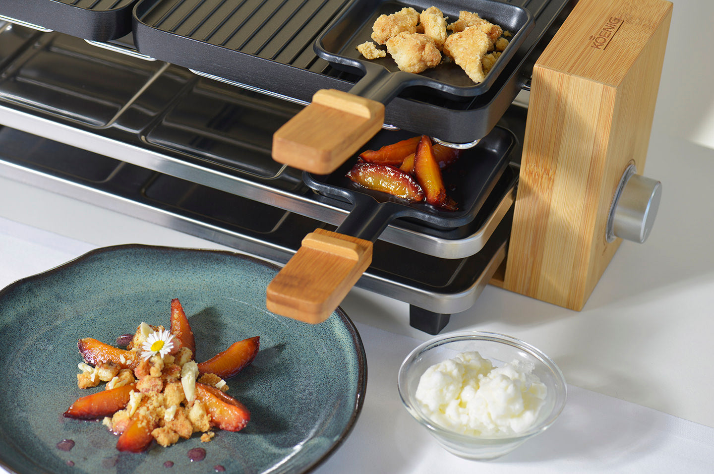 Hachez grossièrement le chocolat blanc et faites griller sur la plaque chauffante du gril KOENIG jusqu'à ce que le chocolat commence à dorer, puis c'est prêt.
