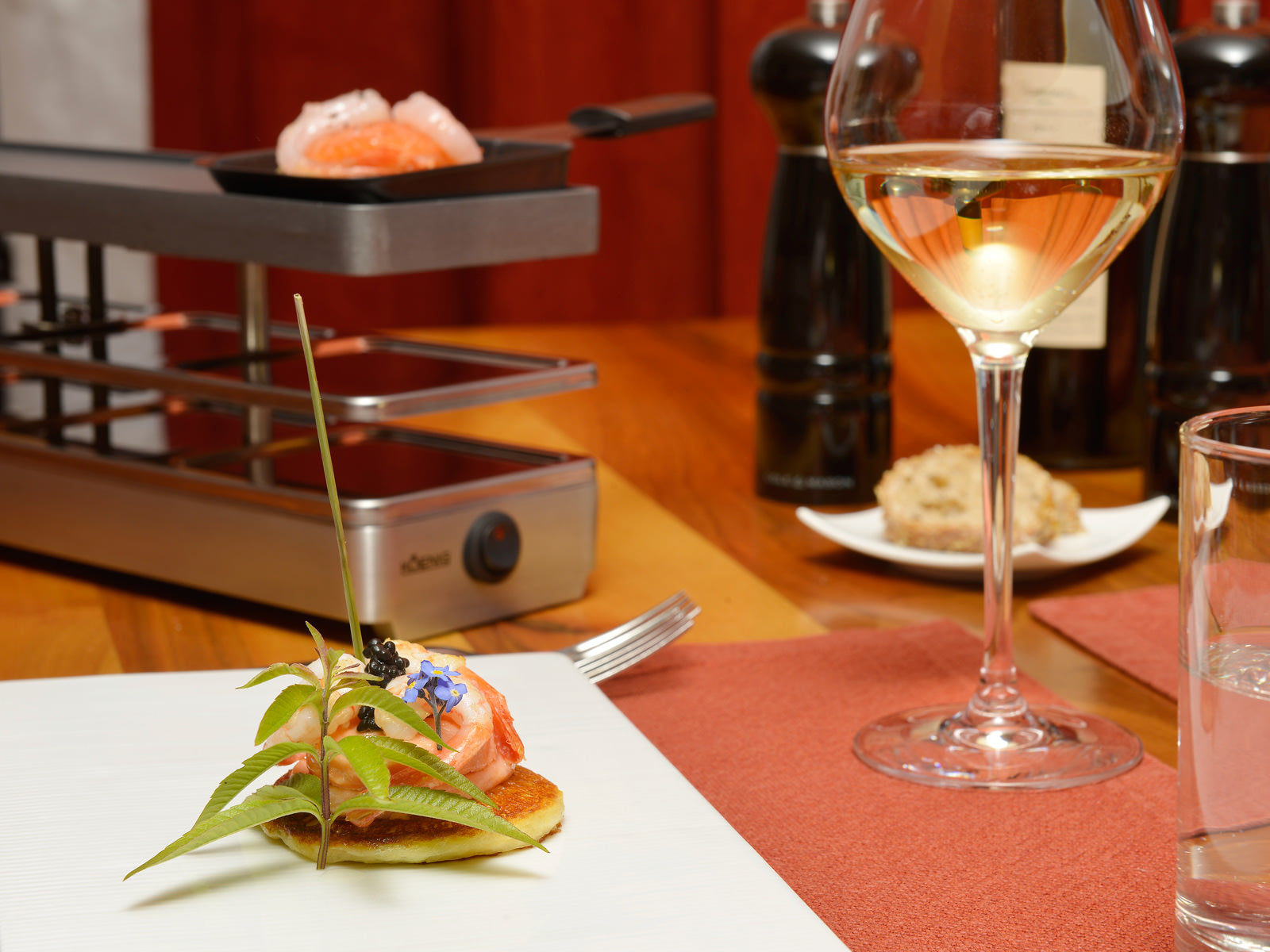 Déposer une tranche de saumon et deux crevettes sur les blinis. Frire brièvement. Si vous le souhaitez, les tranches de saumon et les crevettes peuvent être précuites brièvement sur la surface de cuisson du four à raclette.