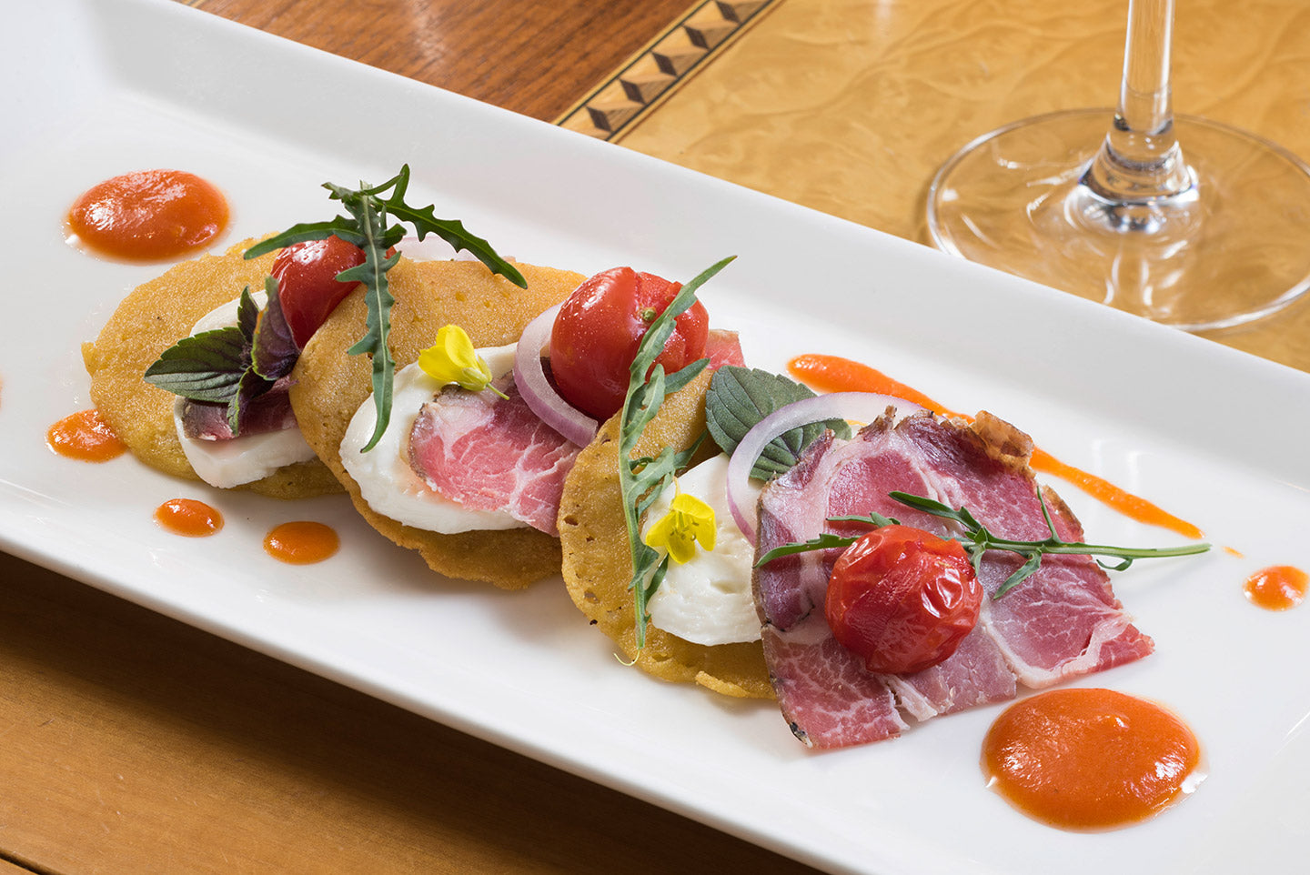 Mille-feuille de socca, tomate, mozzarella et coppa