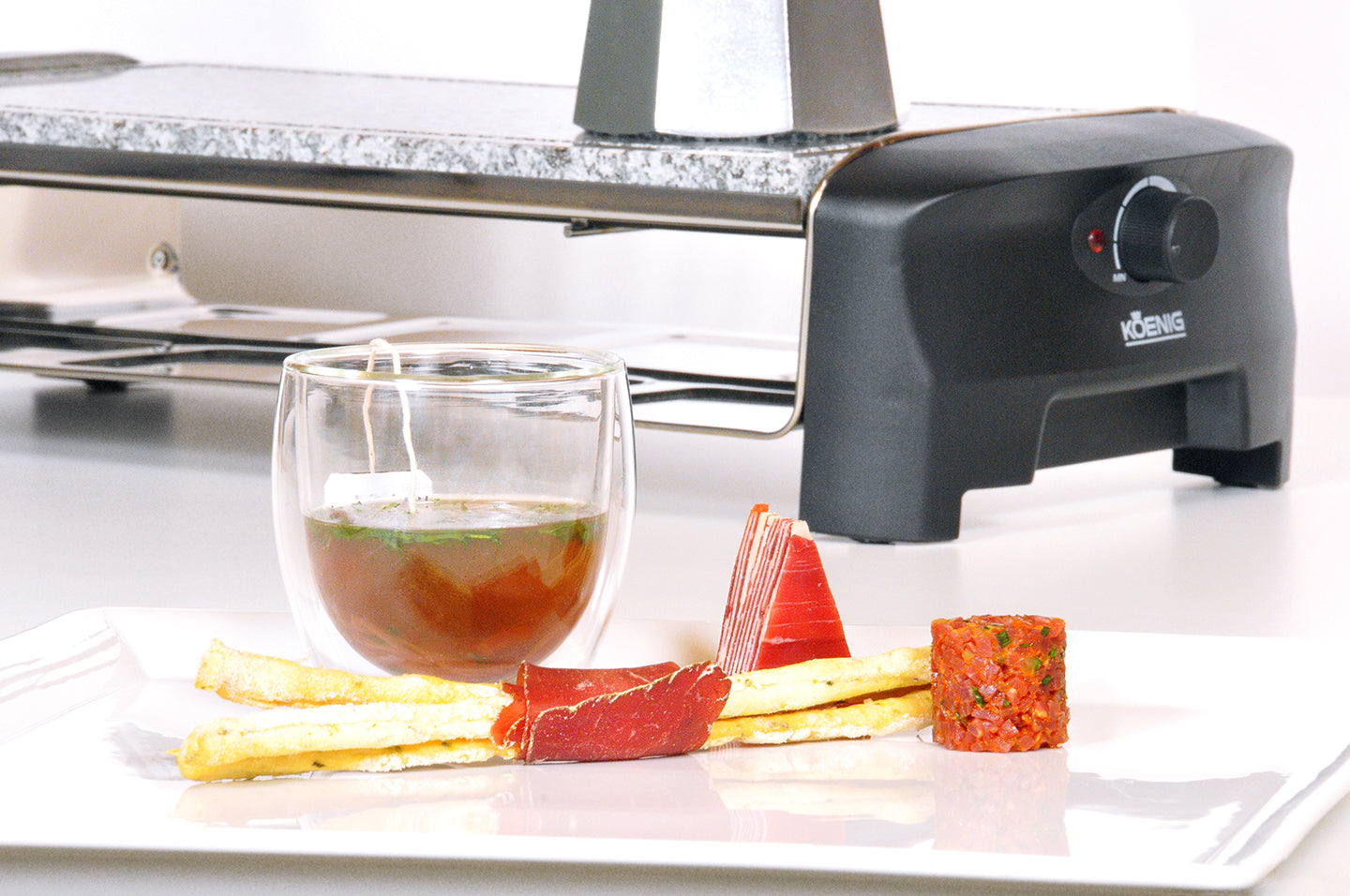 Porter à ébullition 1 l de bouillon de bœuf avec 100 g de cubes de viande des Grisons, la citronnelle et le brin de coriandre dans une casserole chinoise ou dans une casserole sur la plaque du gril de table et laisser reposer 1 heure, puis disposer dans 4 grandes tasses à thé.