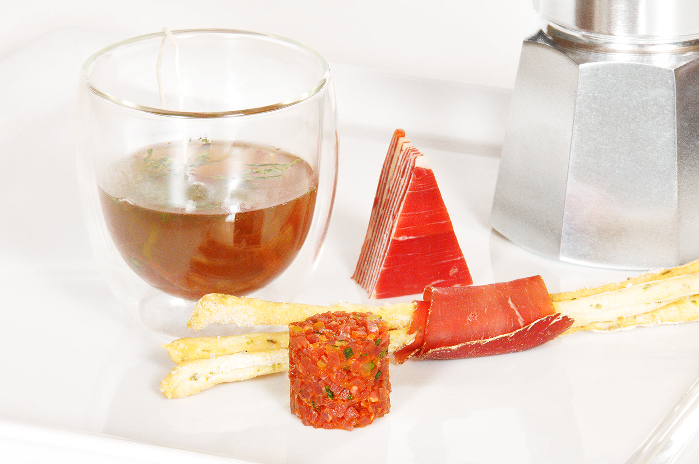 Hacher finement l'échalote et le cornichon et mélanger avec les 100 g de cubes de viande des Grisons restants, assaisonner d'une pincée de moutarde, de ketchup, d'un trait de cognac, de Tabasco, de sauce Worcestershire et d'une pincée de piment d'Espelette et dévisser 4 quenelles. Enroulez 4 tranches de Bündnerfleisch autour des gressins.