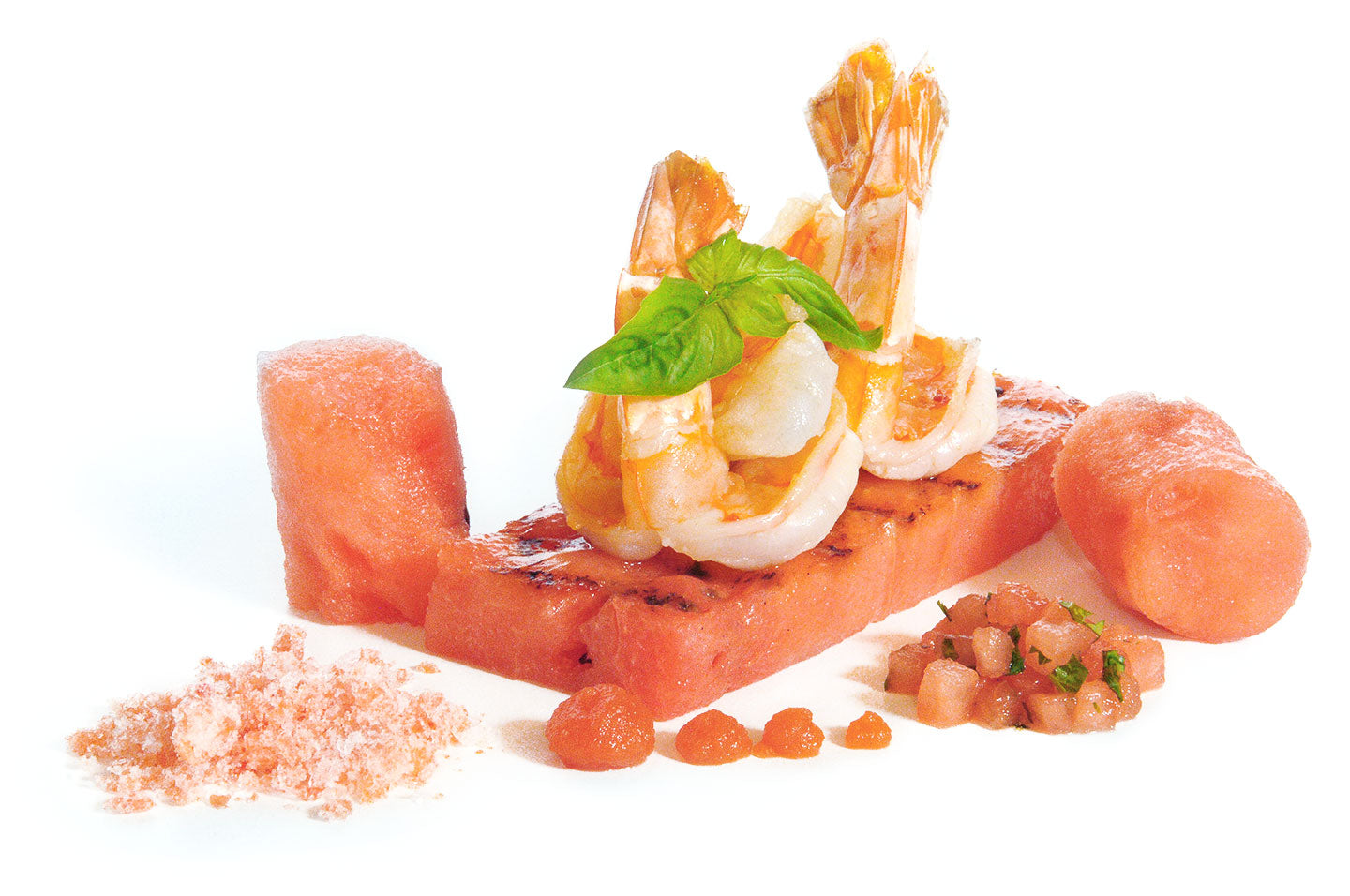 Disposez la tranche de pastèque grillée sur l'assiette. Faites griller les queues de langoustines, marinées avec un peu d'huile d'olive et d'herbes, directement à table.